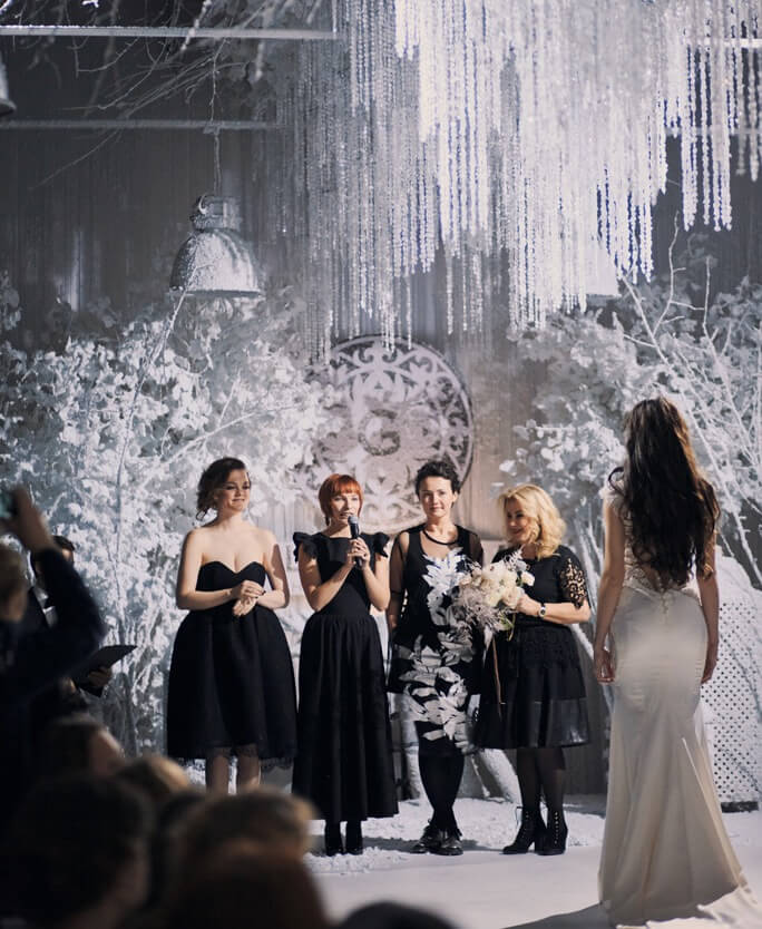 The contrast between exquisite and noble aesthetics of the wedding dresses and rough icy scenery helped to create an impressive atmosphere of the event. Crystal chandeliers adorned the ceiling and the venue was covered with paper snow.