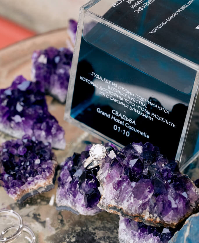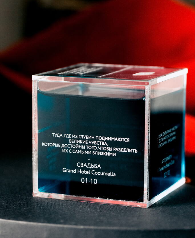 On getting the invitation, one could imagine what a unique and unforgettable wedding it will be. The guests received a box, inside of which they found a transparent cube, filled with blue sea water. The lyrics that described every day of the celebration program was written on the sides of the cube. The wedding scenario developed the idea of the couple's lyrics - «love beckons you out of the horizon line…»