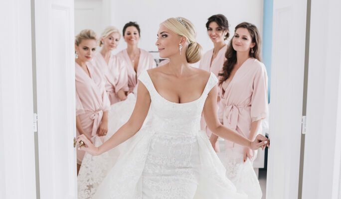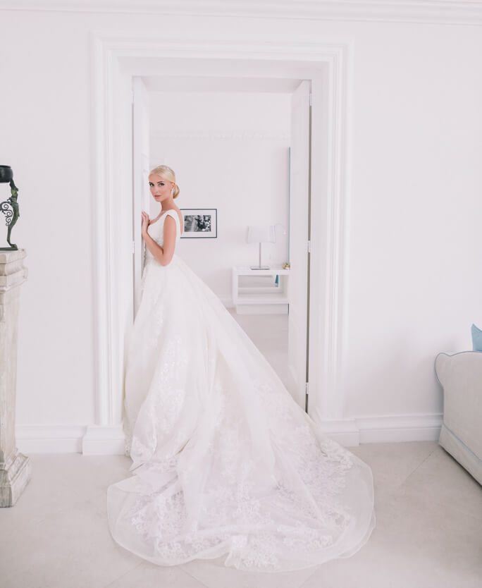 Our bride had visited several countries, before she chose a perfect dress for the wedding ceremony, - a dress by Elie Saab. And a diadem by Damiani, inspired by Romanov's royal treasures, completed bride’s elegant aristocratic look.