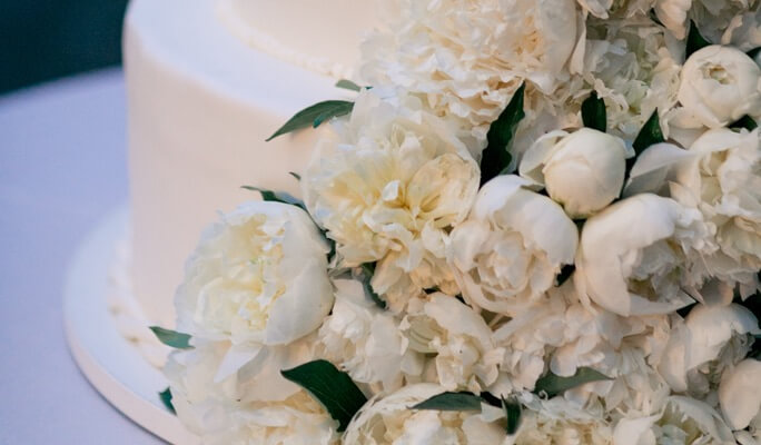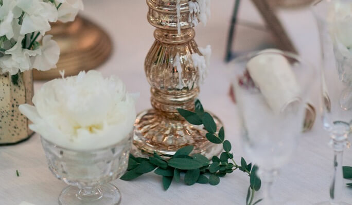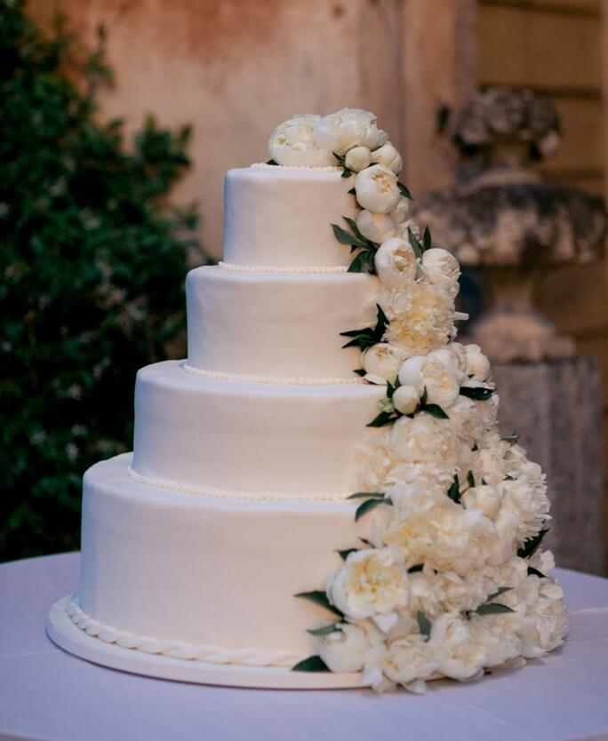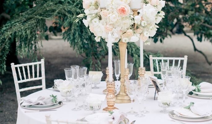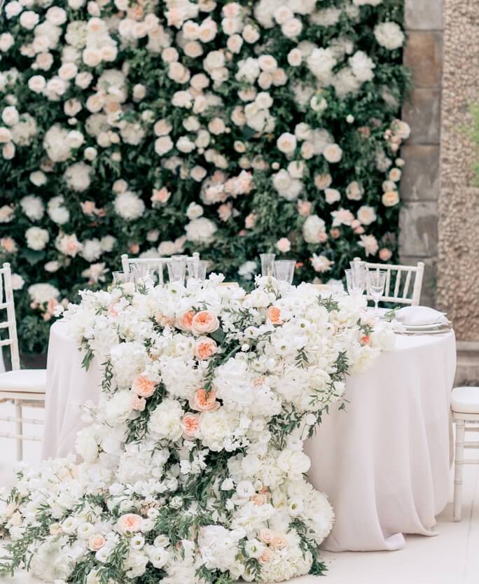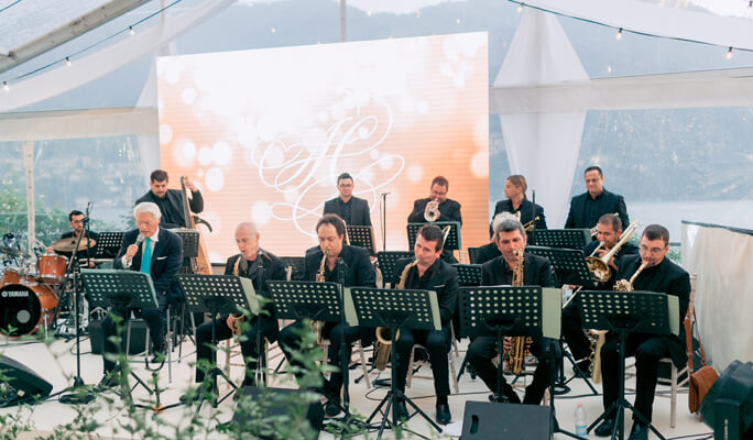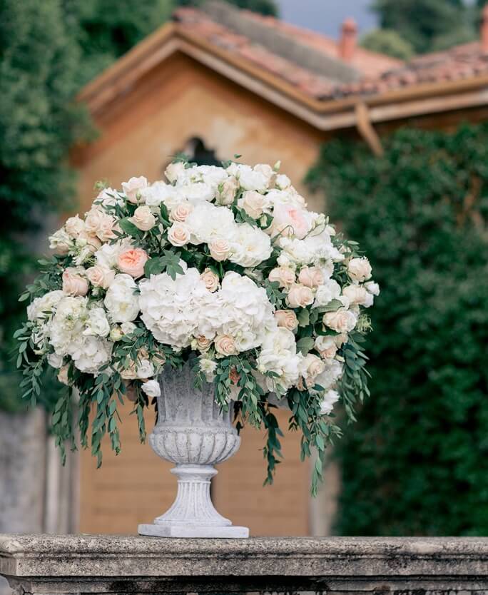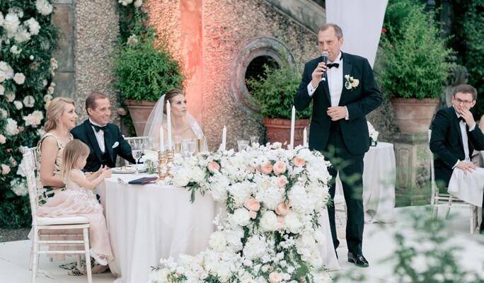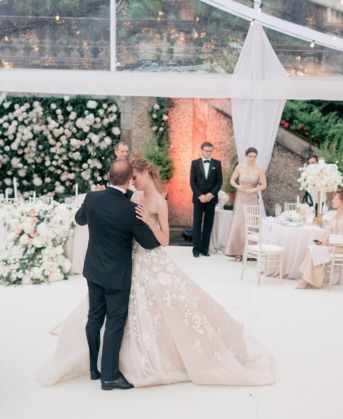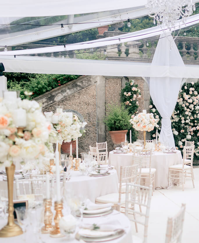 The wedding dinner was held in the wedding pavilion that had a transparent ceiling, decorated with white flowers. The pavilion matched with the architecture of the villa and let the guests enjoy the view on the nature of Italian Como.