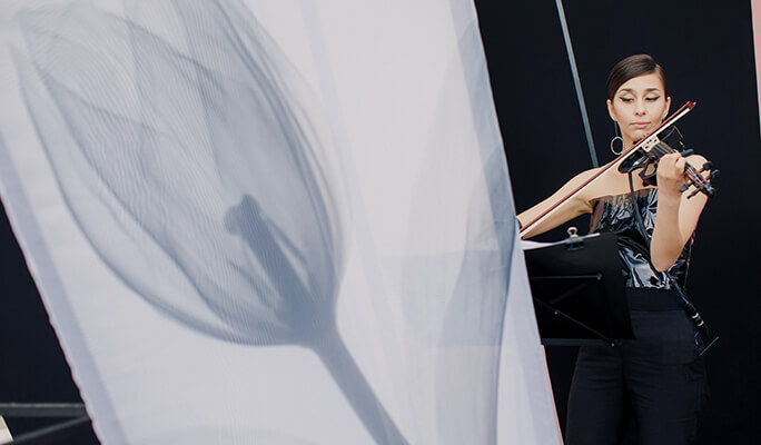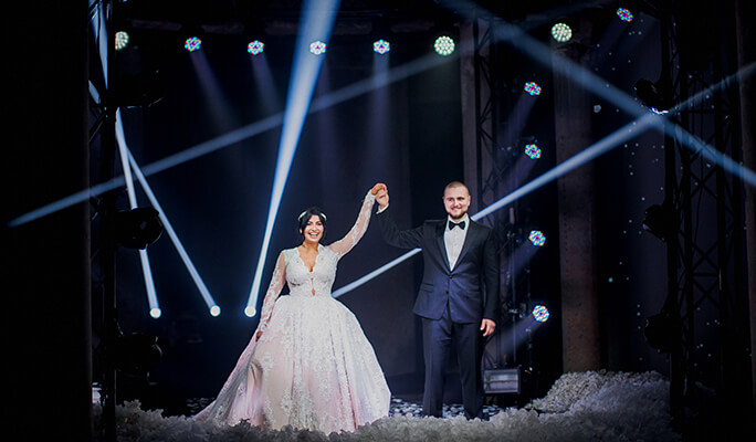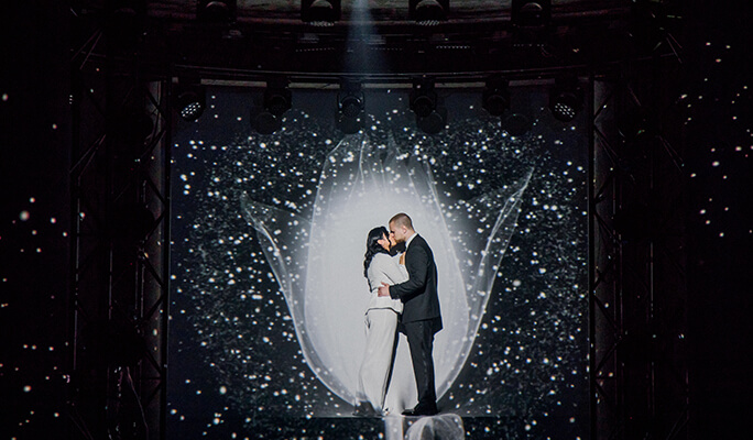 Semitransparent flowers like X-rays let the light through. The hall for the wedding dinner was lit with the bright light, and each guest had a bracelet that began to glow and pulsate to the rhythm of the show as soon as the ceremony began.
