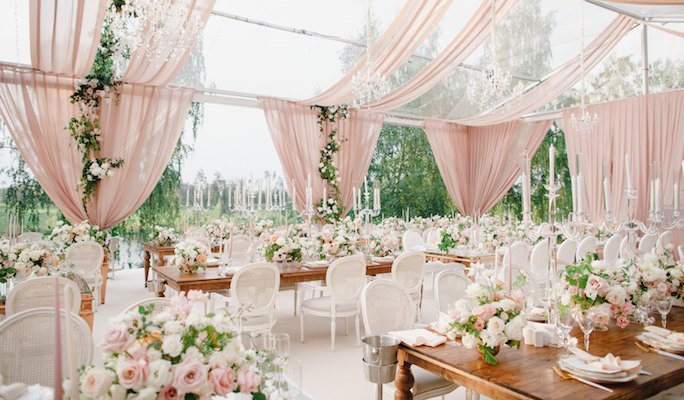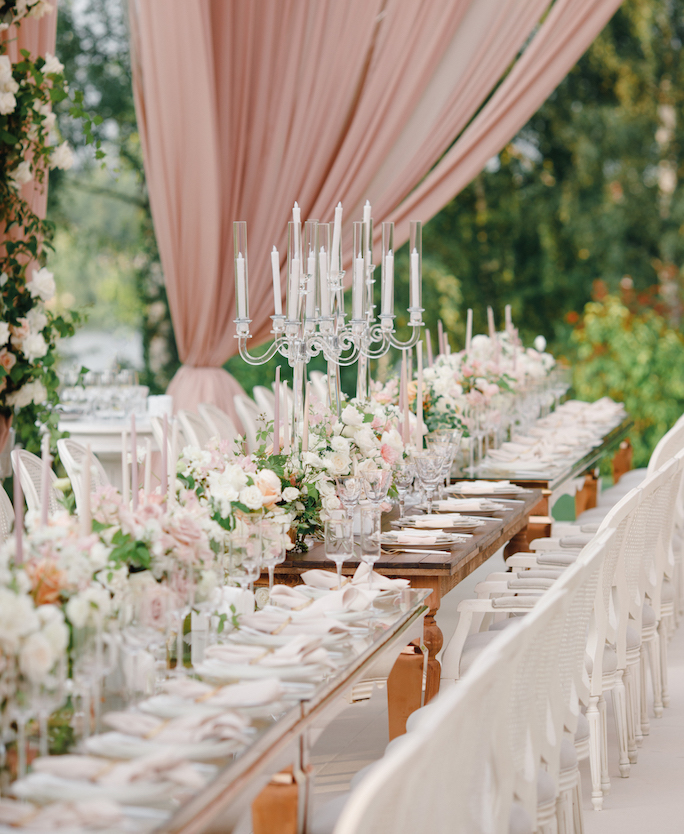 Emin and Alena’s wedding continued with a beautiful dinner in the tent at the Agalarov Estate Hotel. The transparent ground near the river, decorated with roses in pastel colors created the atmosphere of a secular, but informal and heartfelt festive evening.