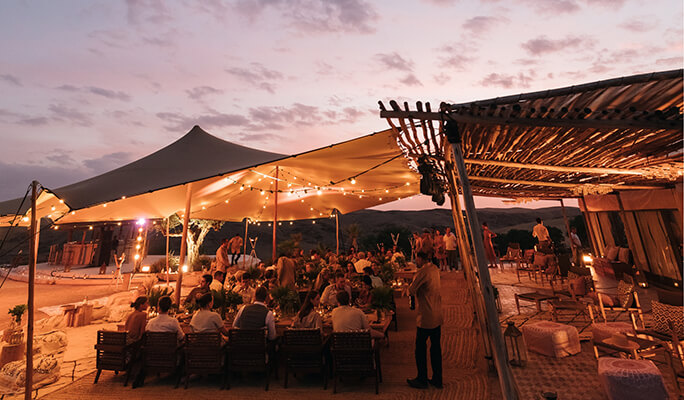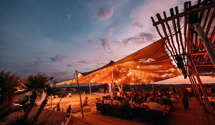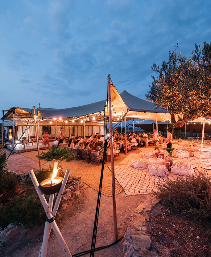 Particular attention was paid to space decoration. Only modern techniques combined with national accessories and elements were used. Moroccan lamps and ottomans in a single light-sandy range and an abundance of candles, greenery not peculiar to the desert — all this added particular contrast and comfort to the deserted location.