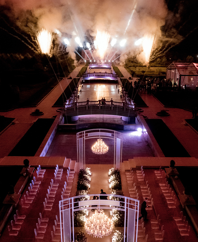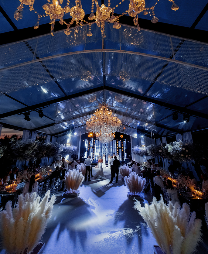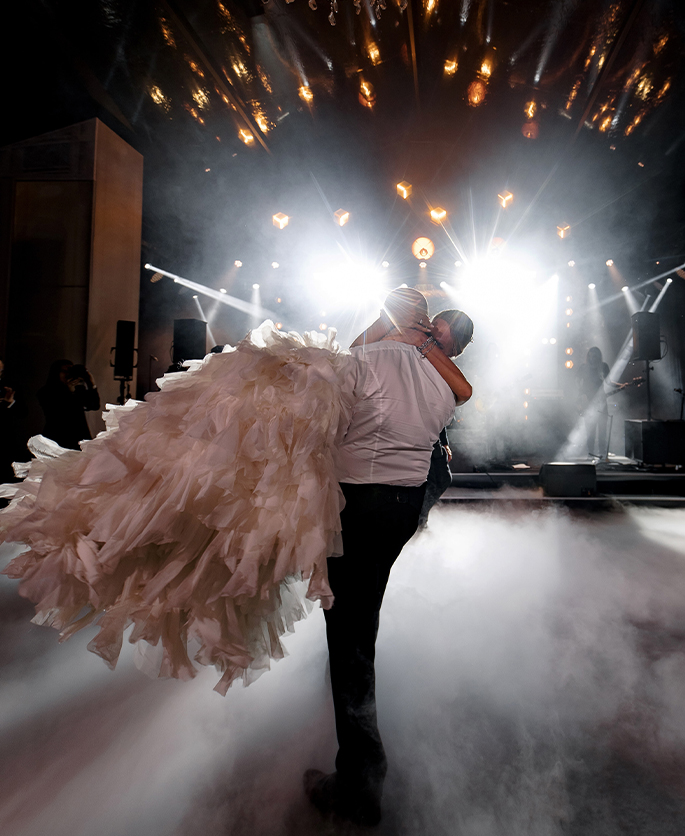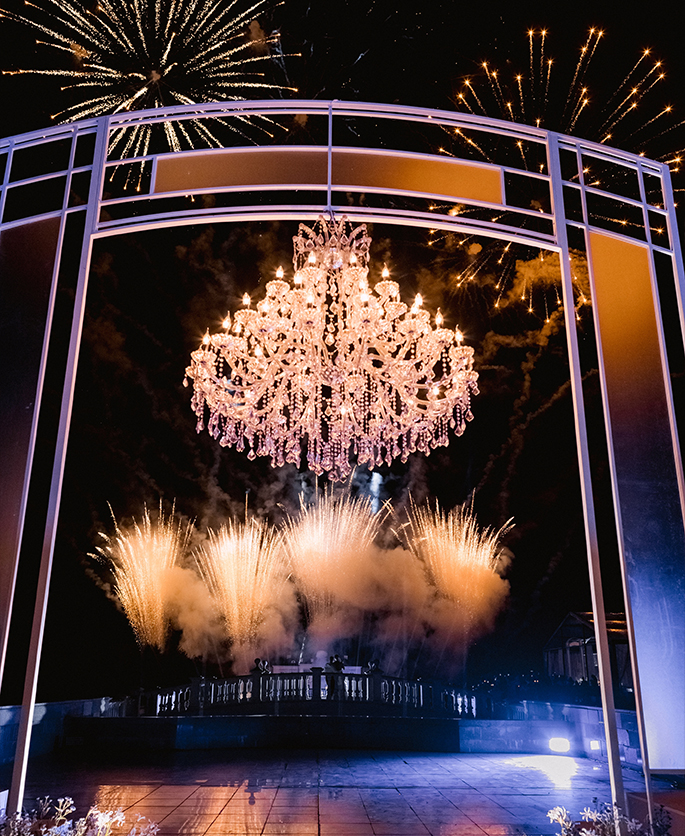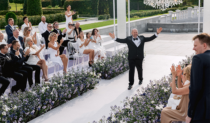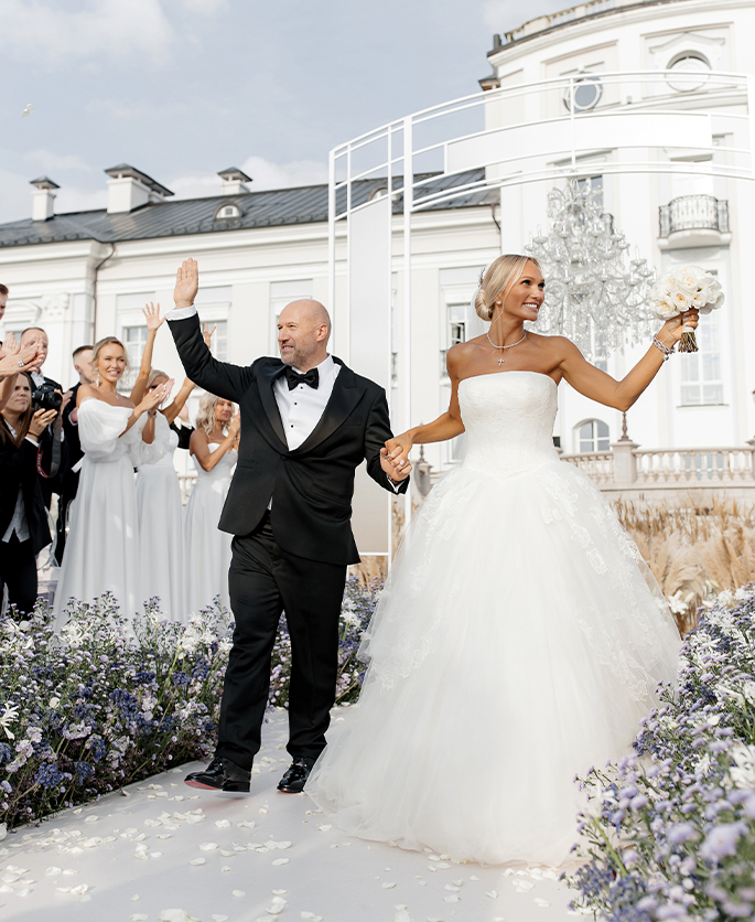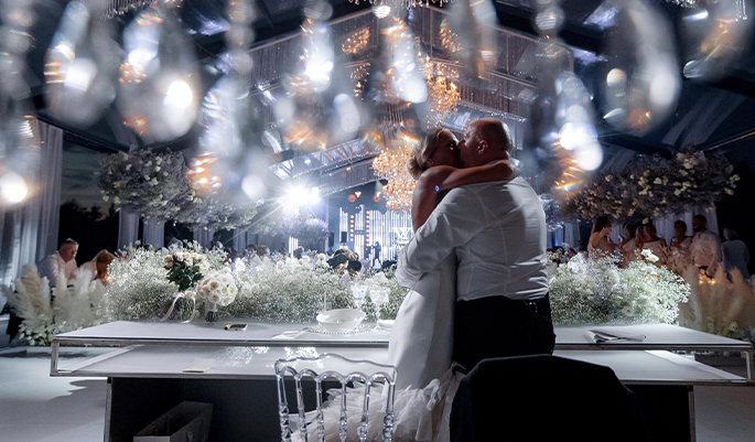 This event was absolutely outstanding! Star presenters Garik Kharlamov and Oleg Savelyev are the perfect union for such a spectacular wedding. They engaged everyone in the action starting from the first minutes. Top singers participated at the entertainment program: Leonid Agutin and Anzhelika Varum, Dima Bilan and Ksana. And the key moment was a surprise from the bride and her friends. The evening ended with an unforgettable light show with fireworks.