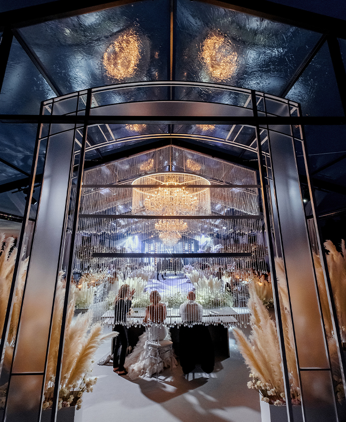 The main areas were decorated with numerous dried flowers. Translucent arches, crystal chandeliers, as if suspended in the air — everything was delicate, beautiful and at the same time actually large-scale.