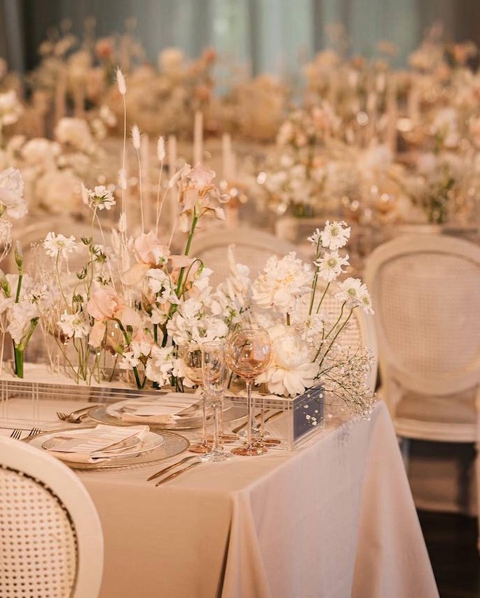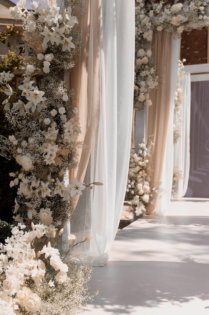We also decorated the ceremony area in a simple and elegant way. The strict forms were softened by airy florals and floating fabrics, which fit perfectly into the exterior of the elite Agalarov Estate cottage village.