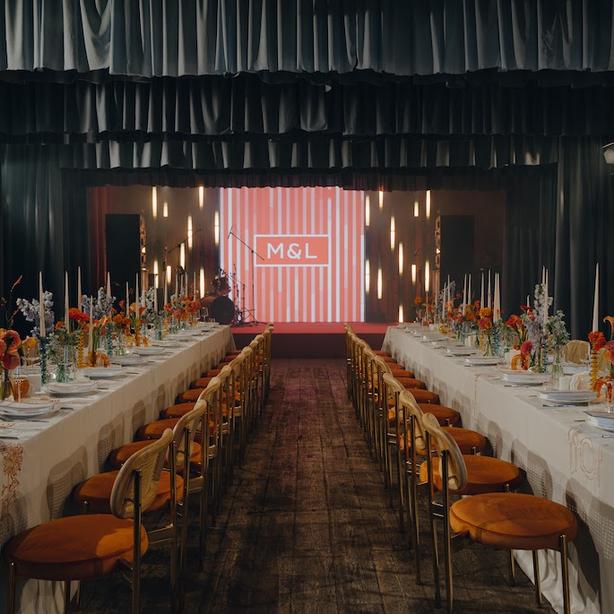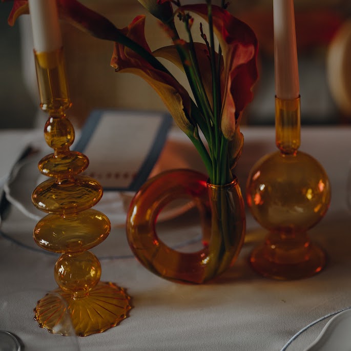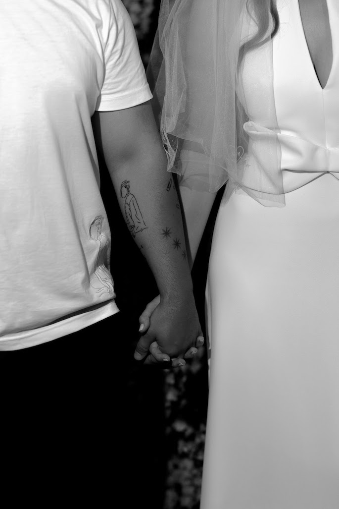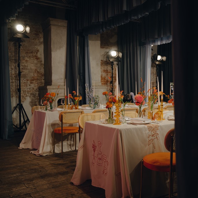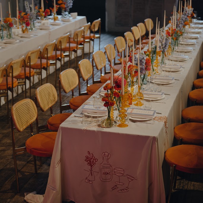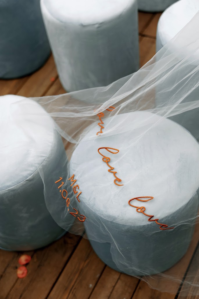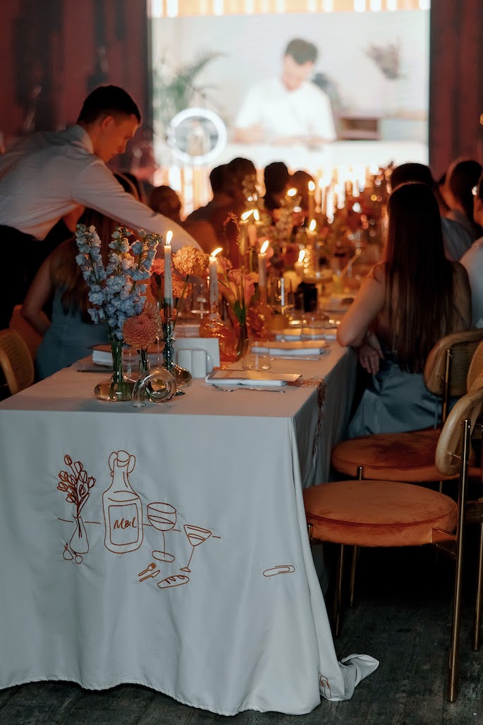 The moment when we brainstorm how to seat the guests opens up whole portals to creativity. This time, we created tablecloths with each guest's name and a symbol embroidered next to their plate, which was unique to them. From the first moments, we wanted the guests to understand that they were expected, thought of, and prepared for. The tablecloths also featured embroidered sunflowers and office clips. These were not just random elements; they represented the groom's favorite tattoos.