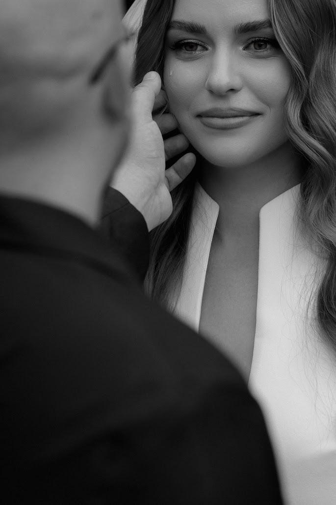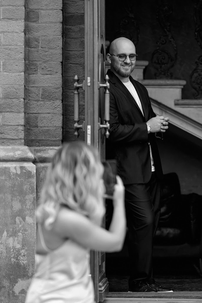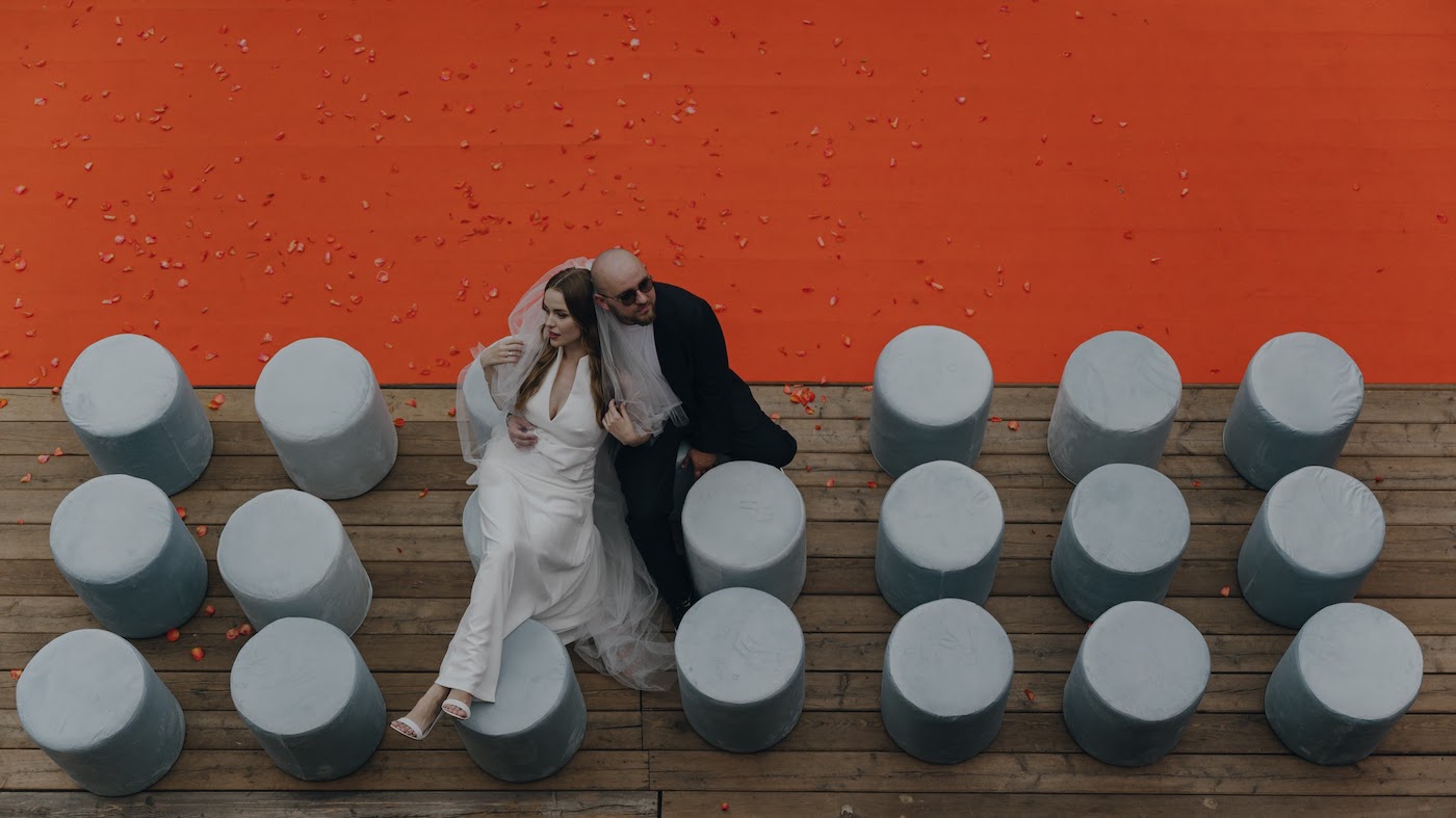 Lisa and Maxim didn't want their love story shoot to consist of overly romantic but unnatural shots. We thought that if it were a film — a film about them and their wedding — it would be an ironic take on staged shots in the style of 80s Soviet cinema.