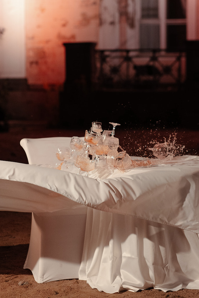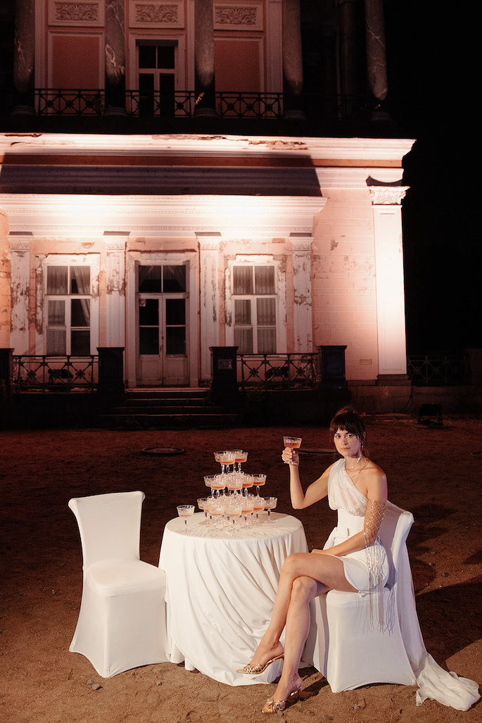 Then, the couple stood up from the table, and Nastya's train turned into a tablecloth on which stood a pyramid of champagne. As you may have guessed, at the end, it was spectacularly shattered - for good luck!