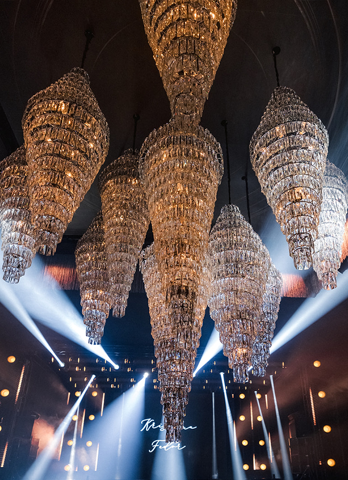 We love doing multiple locations throughout the evening. It helps to create additional experiences for guests and create just the right space for a specific purpose. So after dinner, we took guests on golf carts to the hotel yacht club. Here they were immediately immersed in the atmosphere of a glamorous bar with musicians and dancing. In the center of the hall we hung a huge glass chandelier, put the light so that it shimmered with thousands of lights and became the main art object of the evening (after Christina's incredible outfits, of course).
