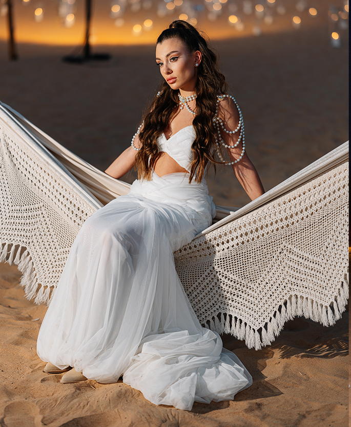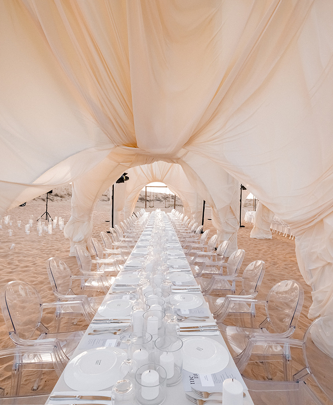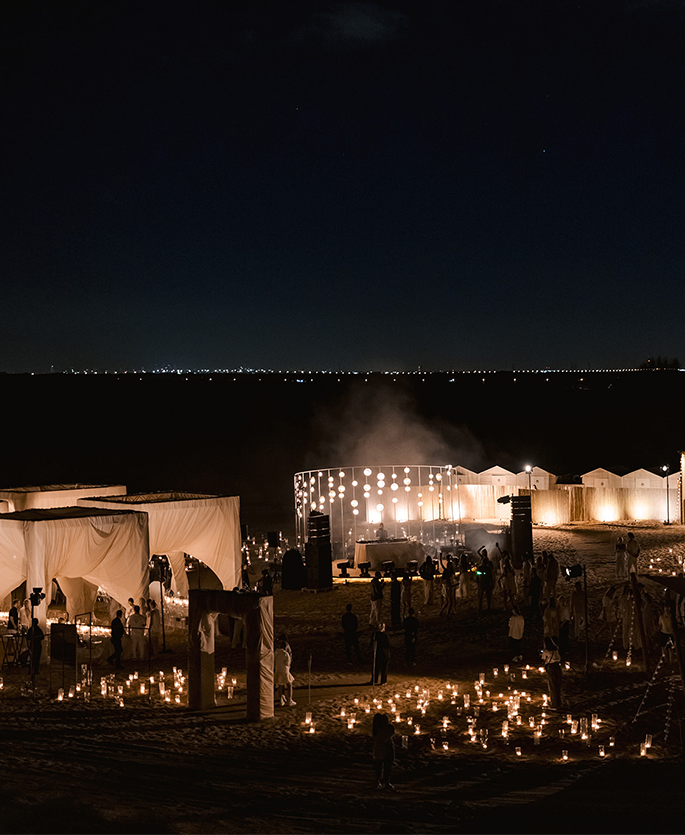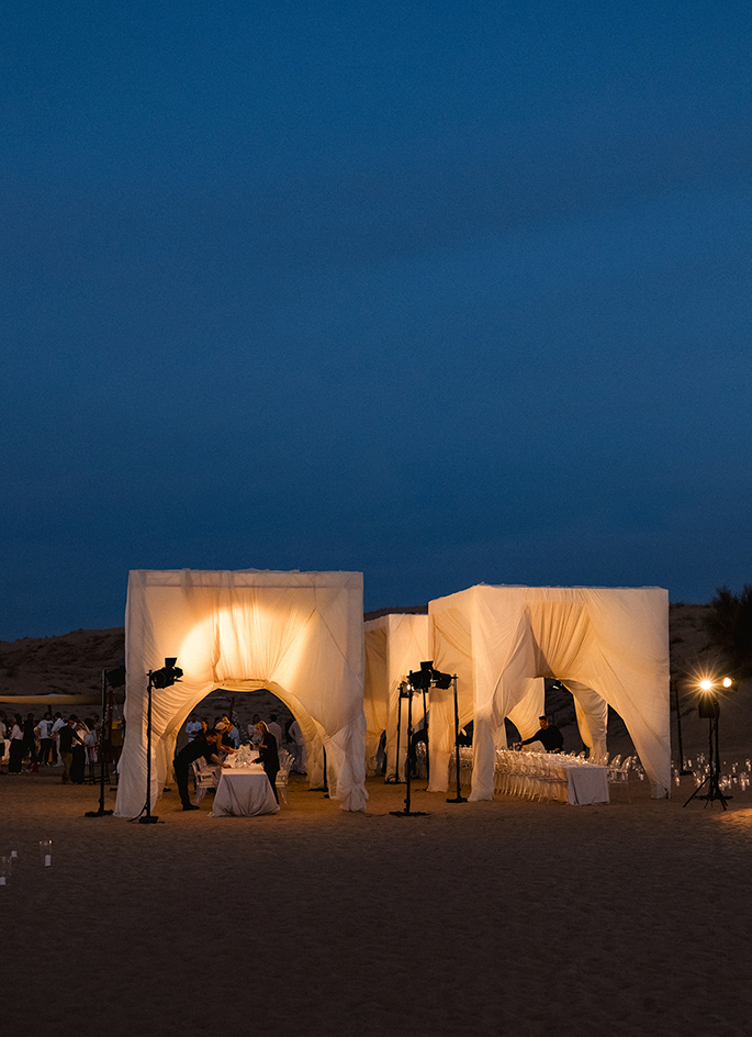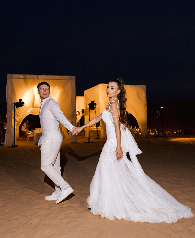 As you have realized, everything did not end at the yacht club of the BVLGARI Hotel. The next day we moved the guests to the desert, now we will tell you how it was. The guys and their friends love partying. So in the desert we had a rave in the middle of the sand dunes under the stars. Sand, heat, and lush luxury are the perfect components of a lovestory for a wedding that takes place in Dubai.