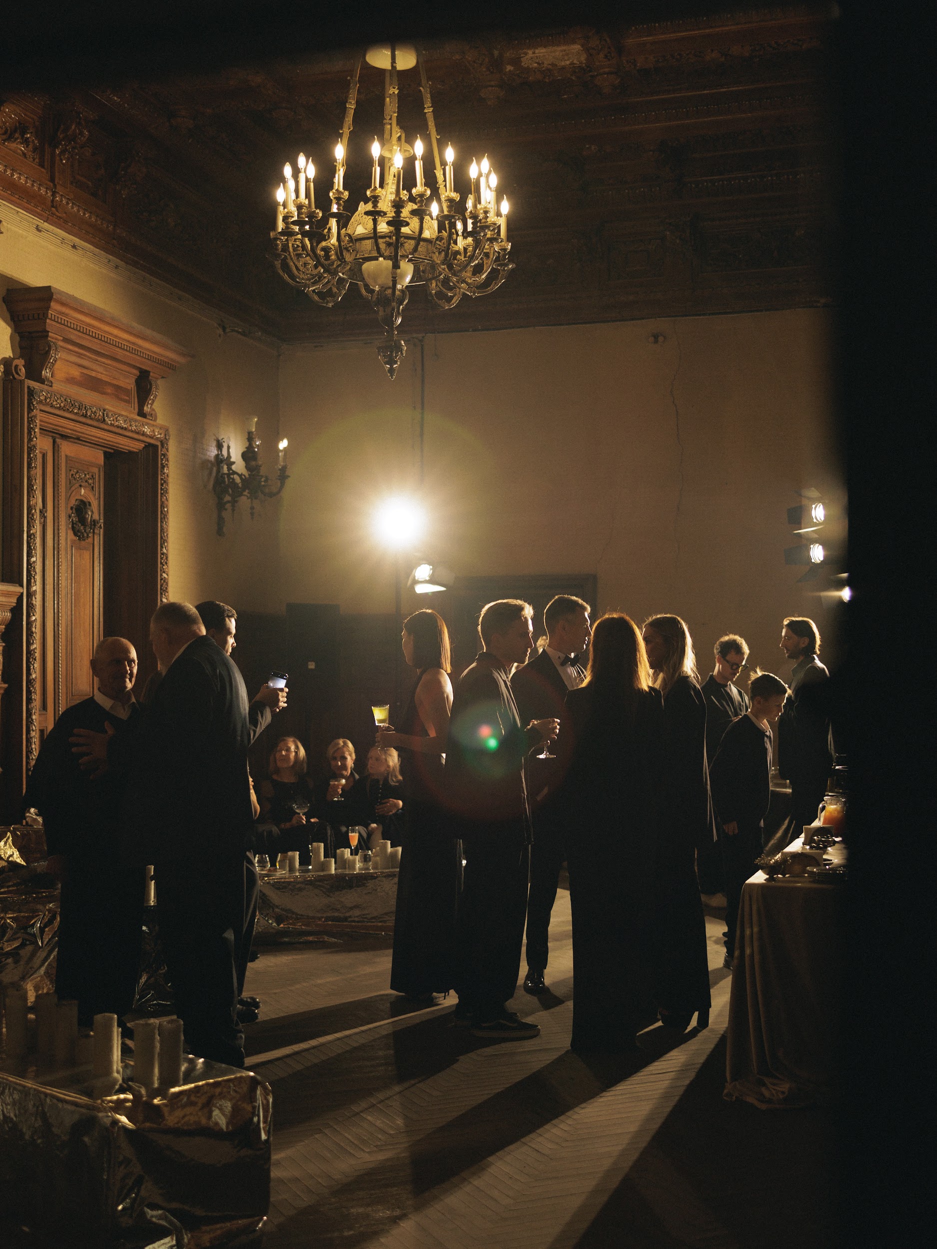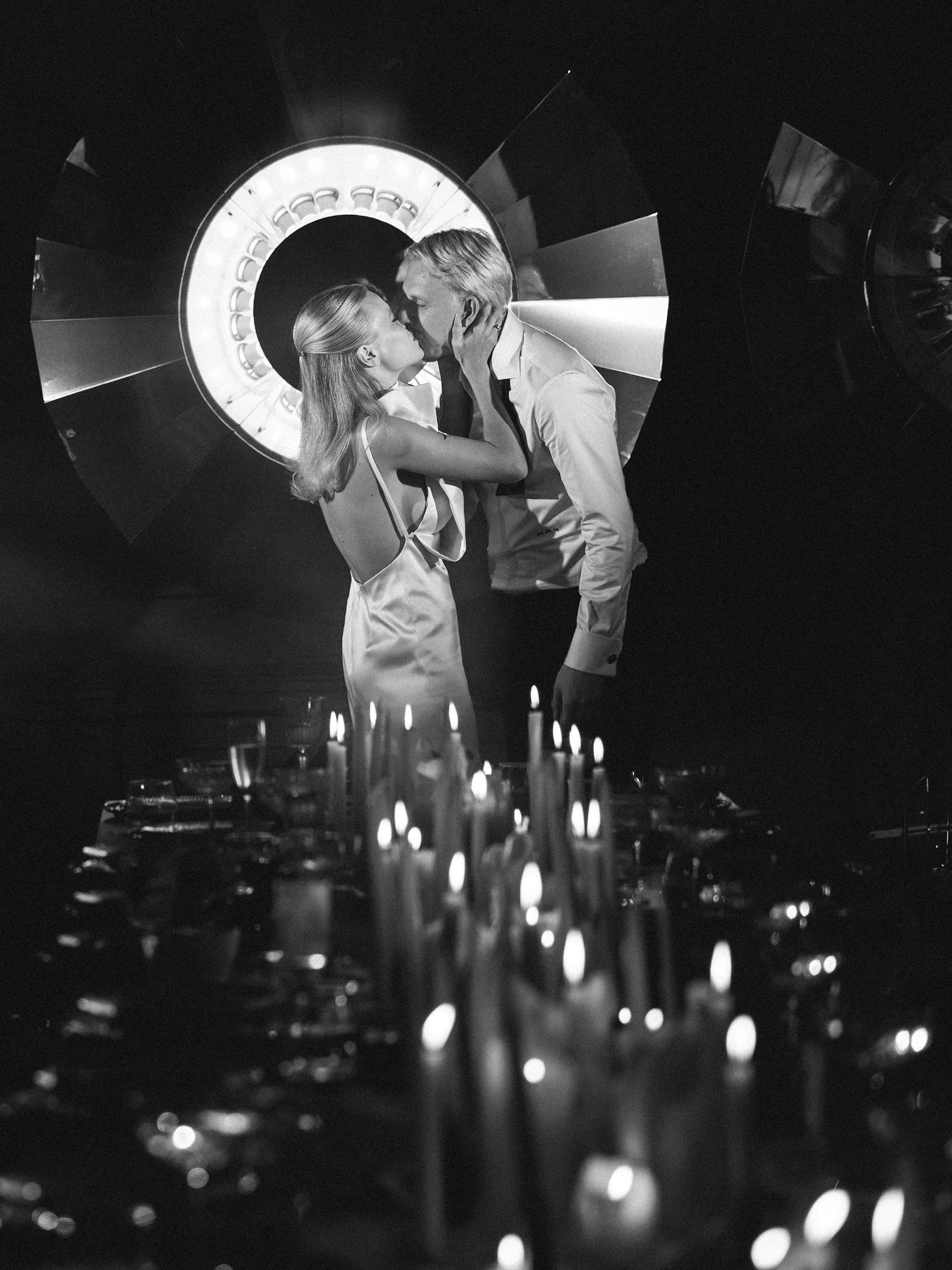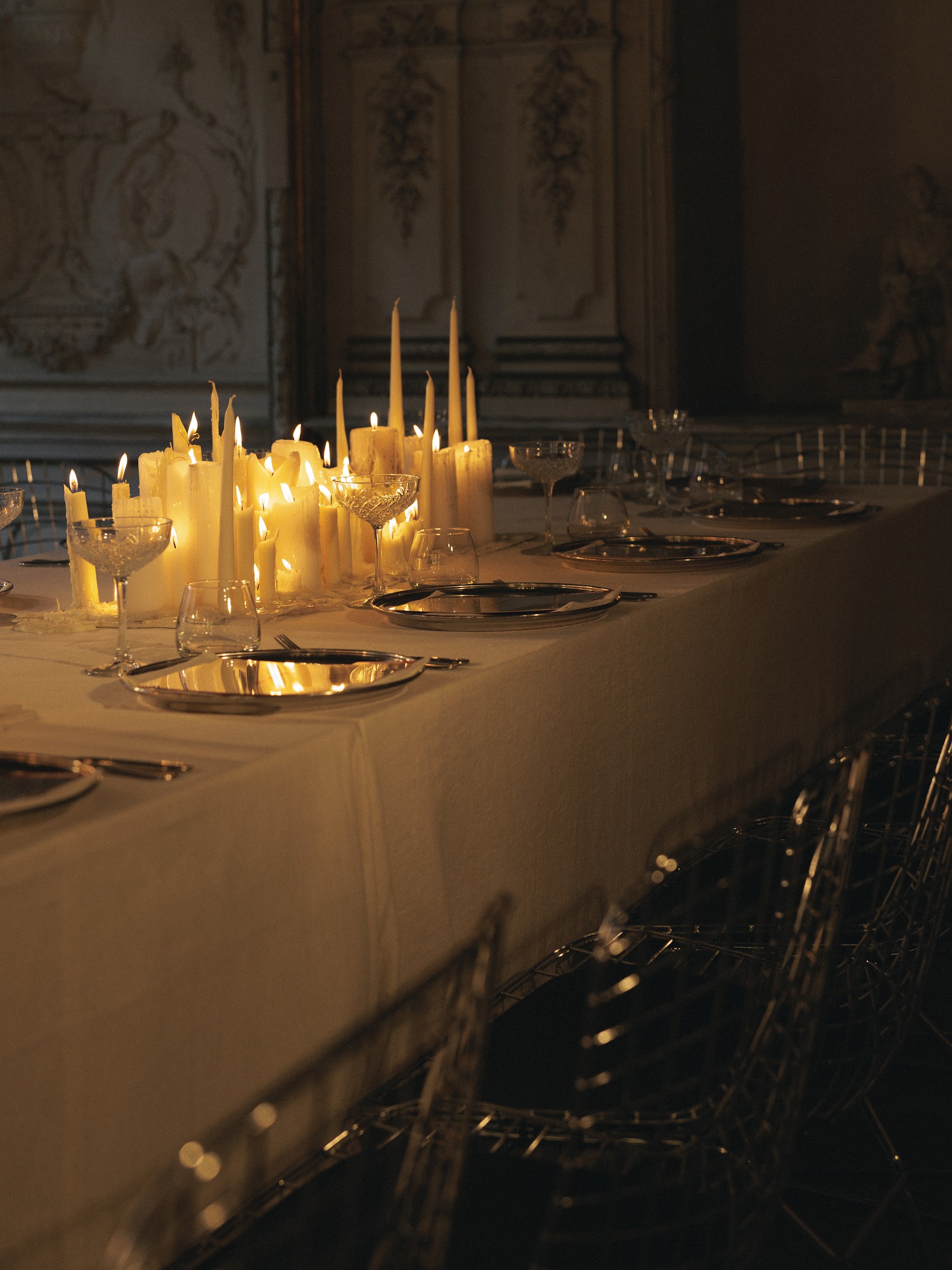 As for the dinner decor, we really wanted to make it not just classic, but to show the room in a new, modern and trendy way. Therefore, we left the main room of the mansion untouched, and only placed a table there for dinner and lit candles. We installed devices that were specially made according to our sketches by Nastya Goncharova. This reflects the inner world of Katya and Misha: respect for classics and traditions, but at the same time very modern, stylish and advanced. As our team likes to say - very beautiful.