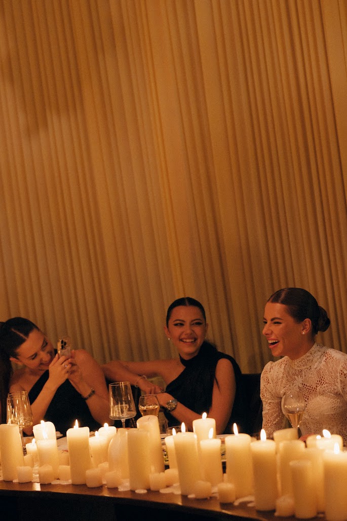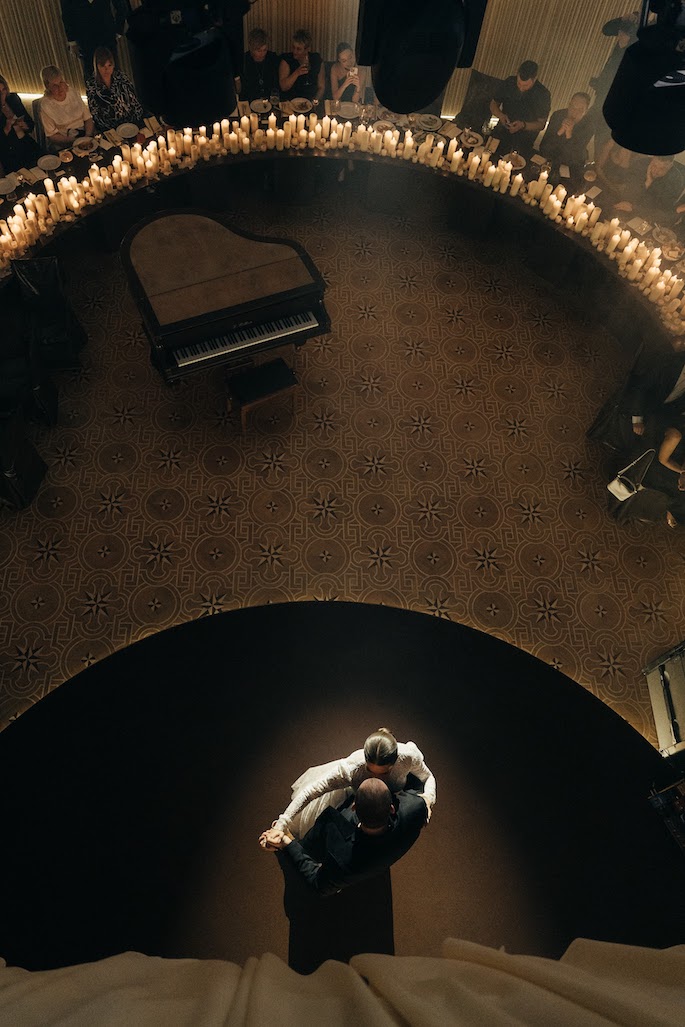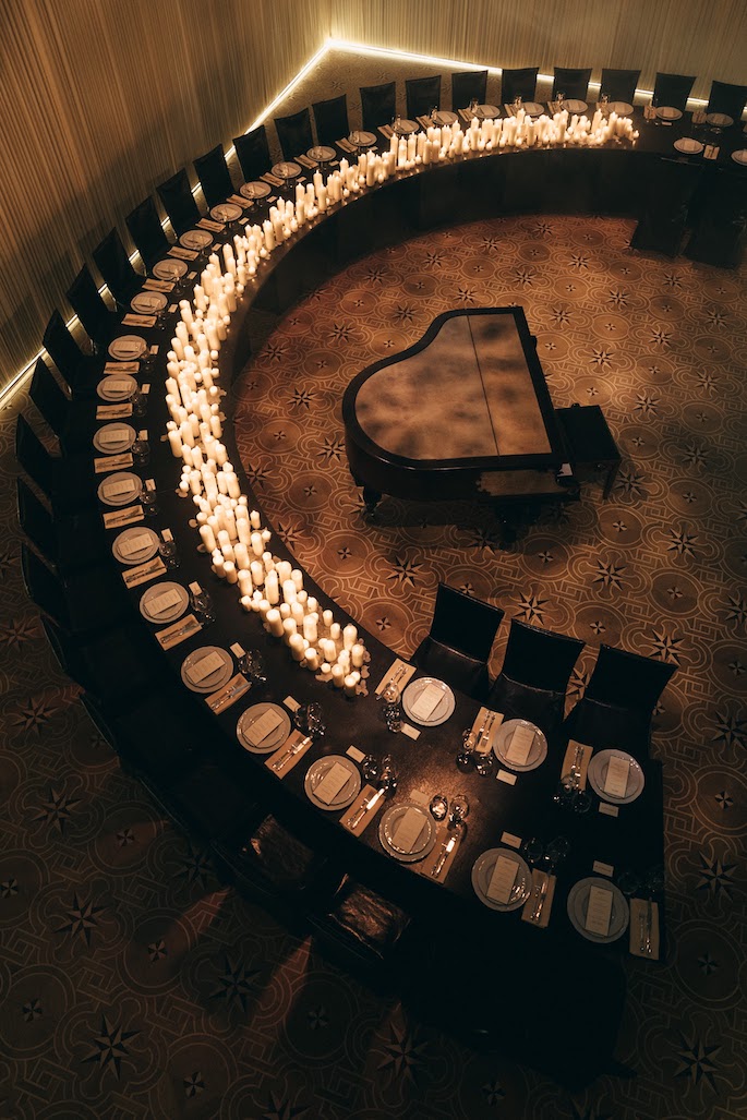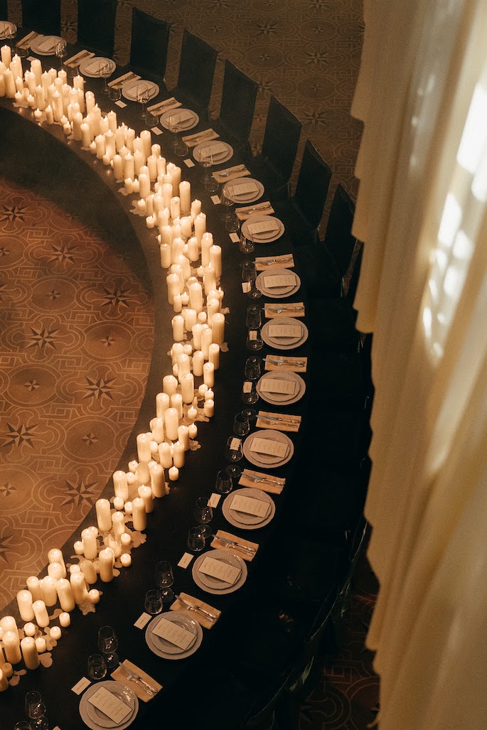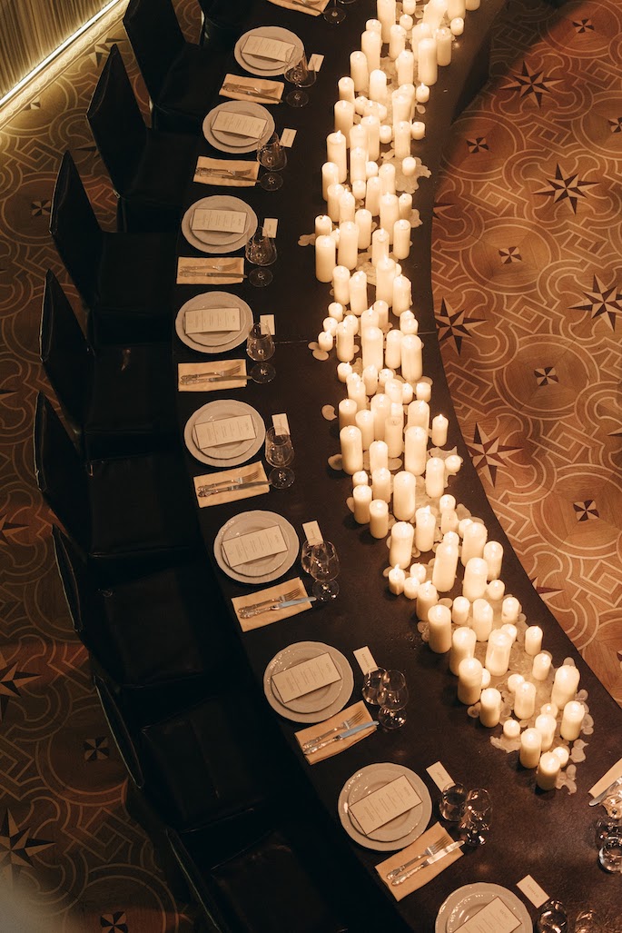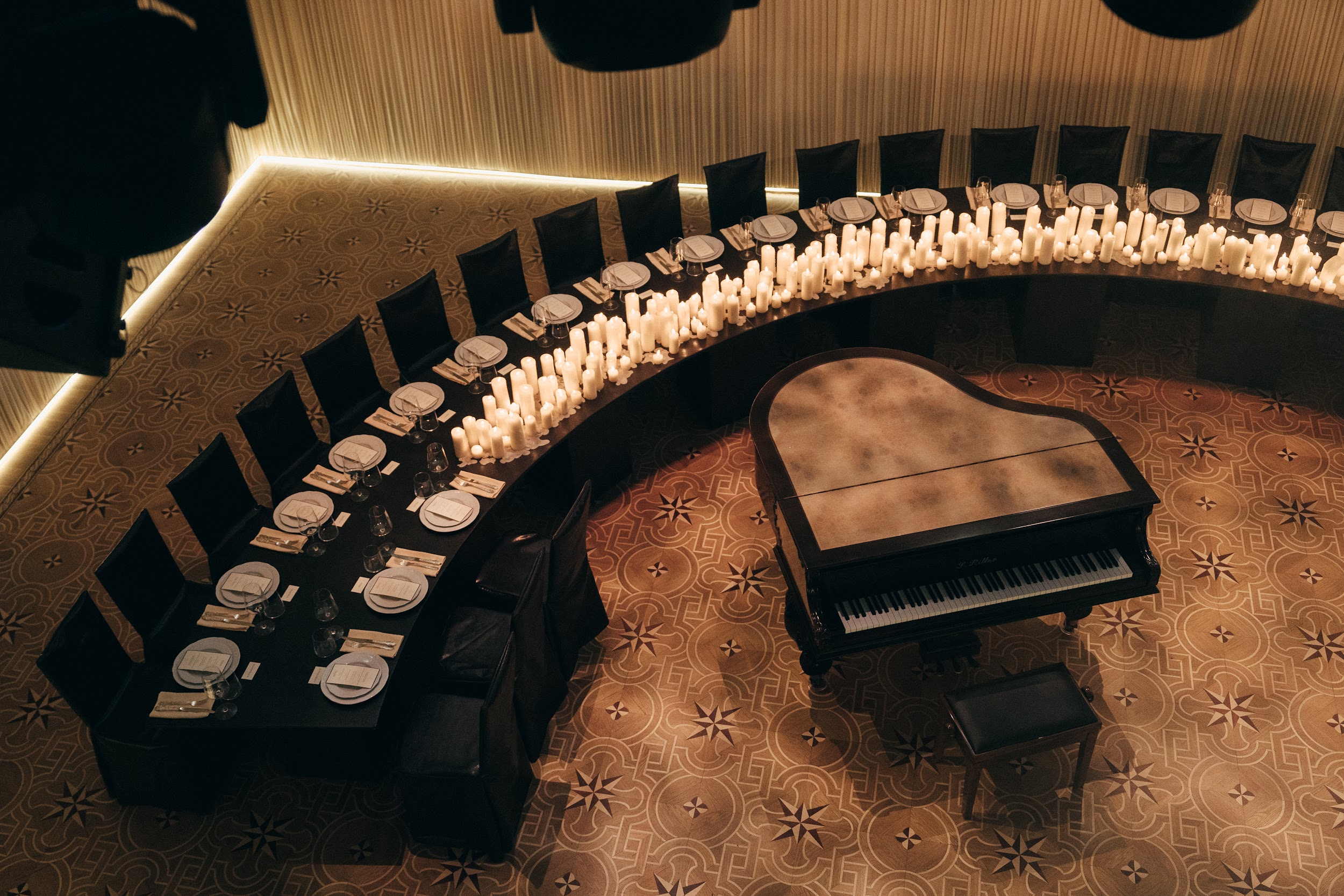 Initially, the banquet was planned in another hall, but due to the increase in the number of guests, we moved it to the ballroom. The walls were decorated with creamy draperies, a grand piano was placed in the center, and a semicircular table with leather trim and lots of candles became the main accent.