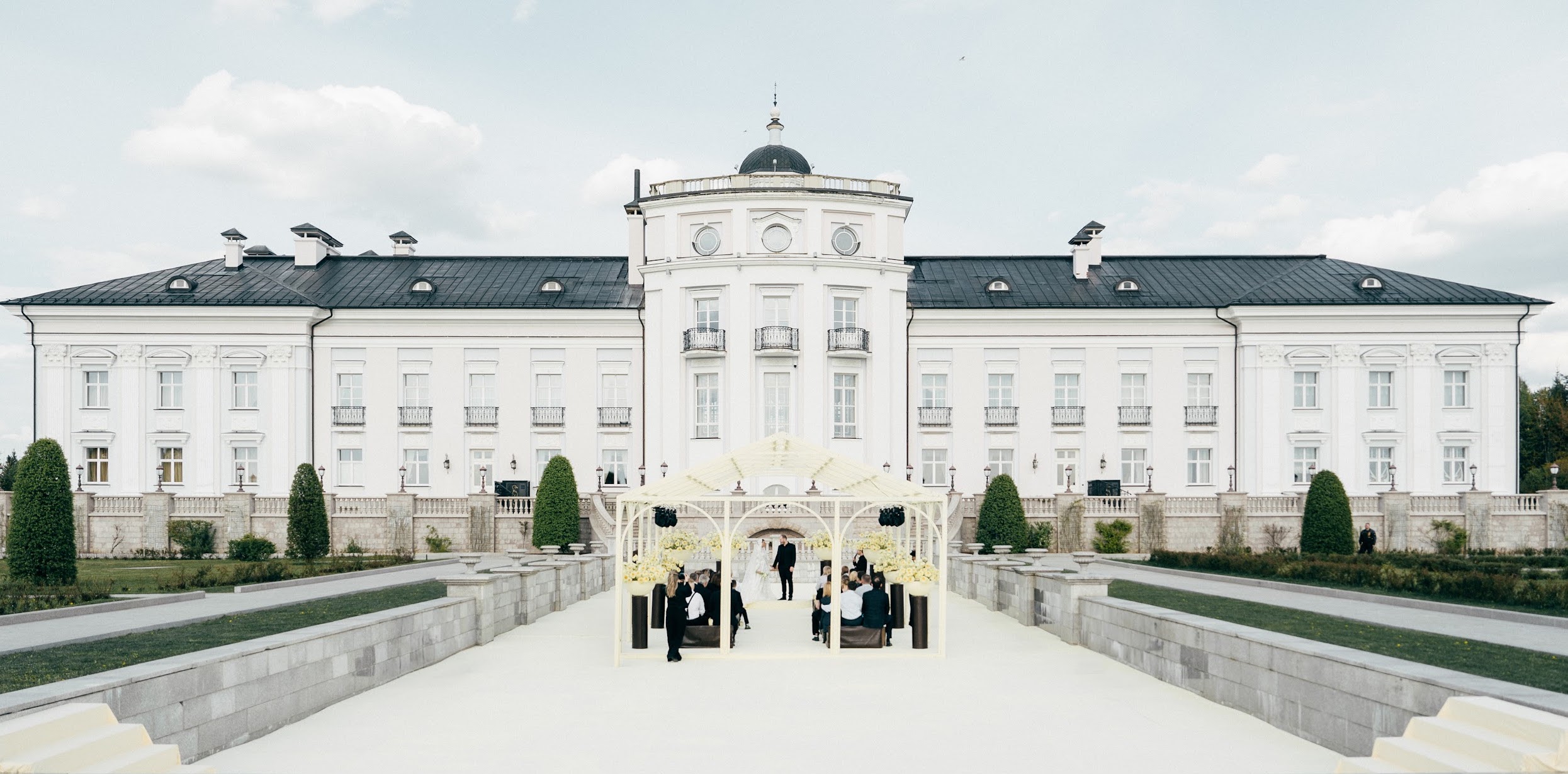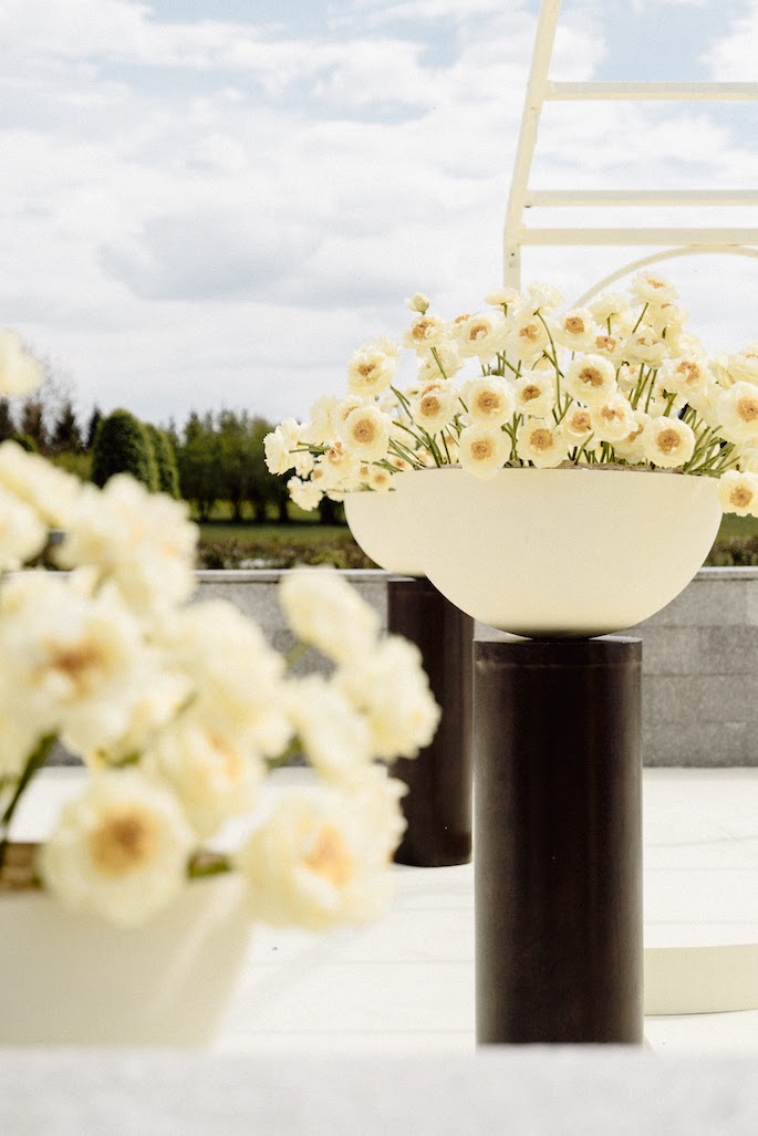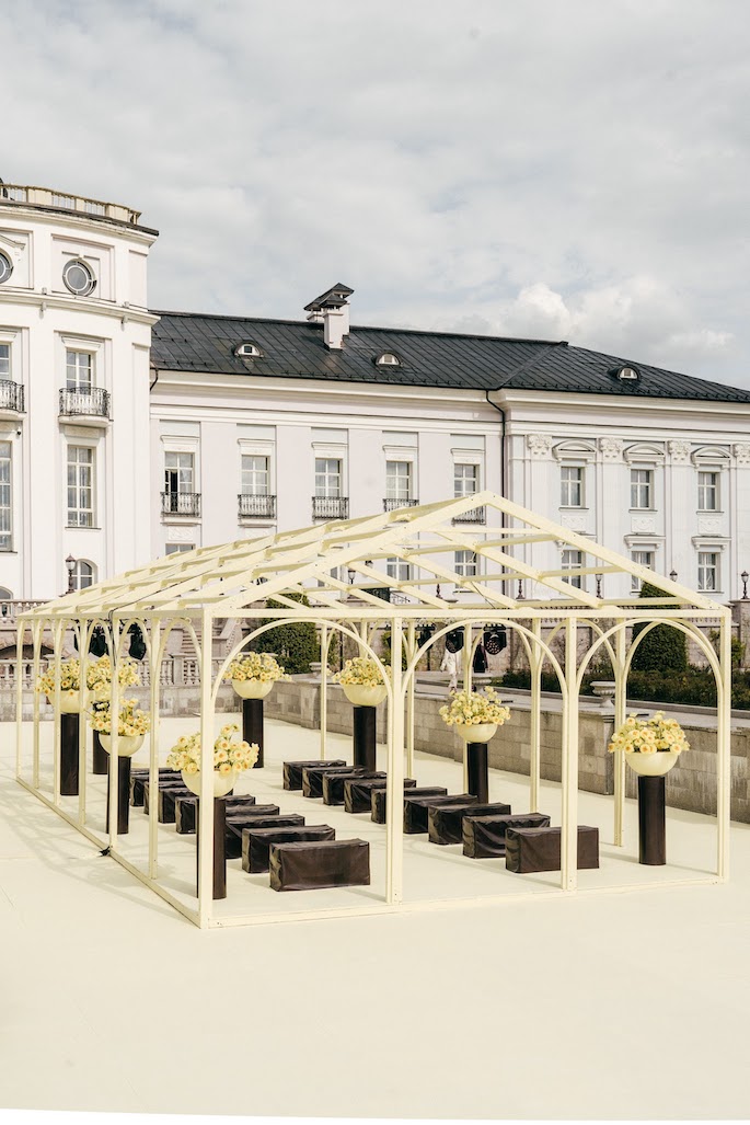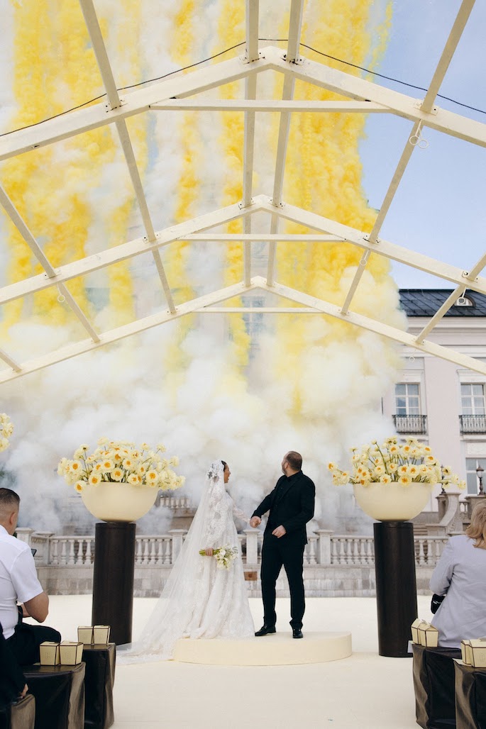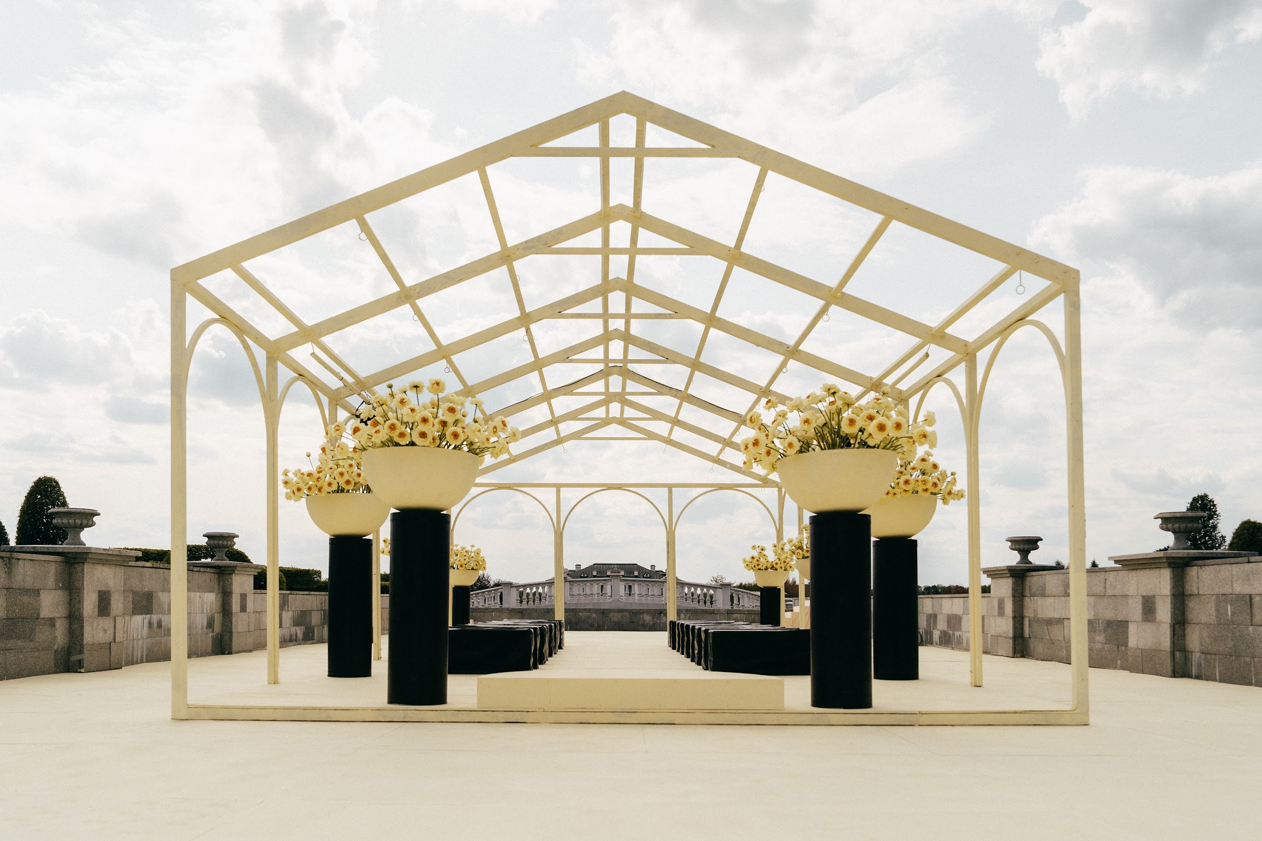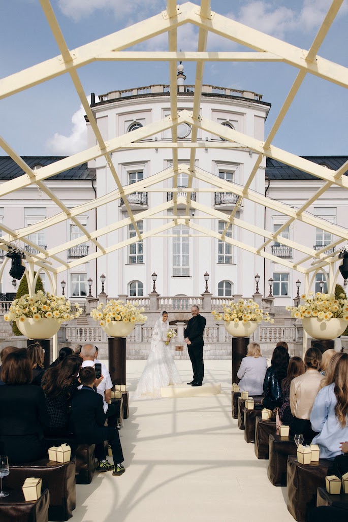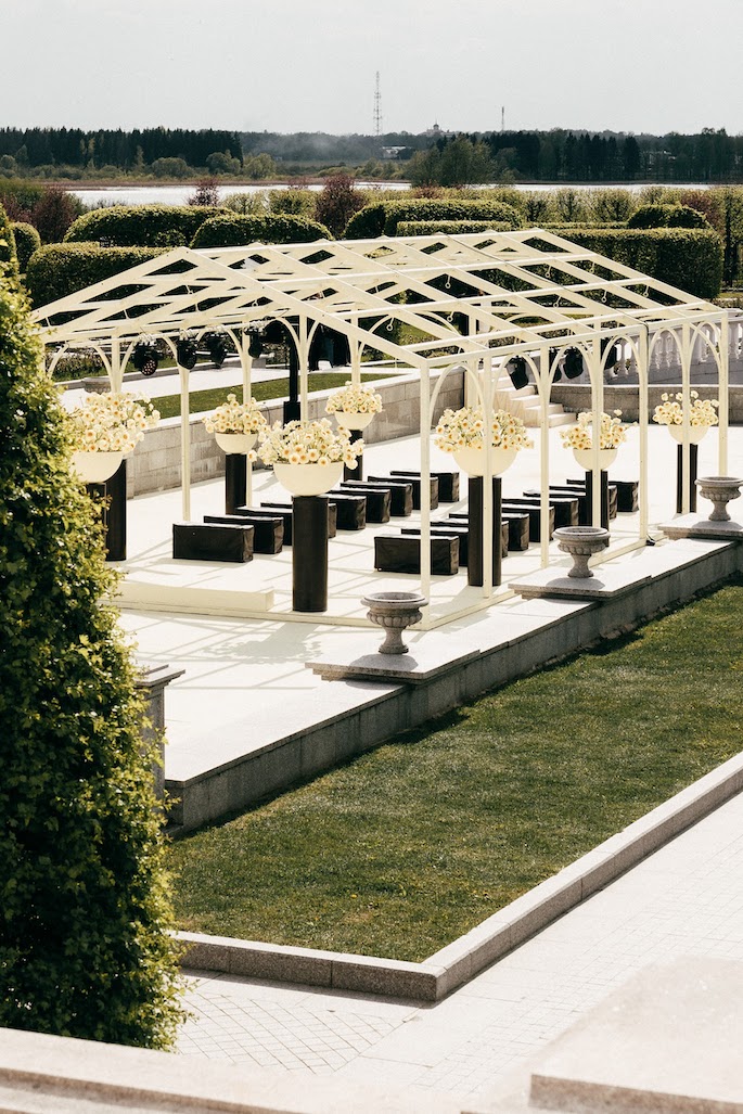 The bride's main wish was a ceremony among cascades of fountains overlooking the villa. We have maintained a balance between privacy and solemnity: a minimalistic gazebo framed by yellow peonies has created a cozy and festive atmosphere.